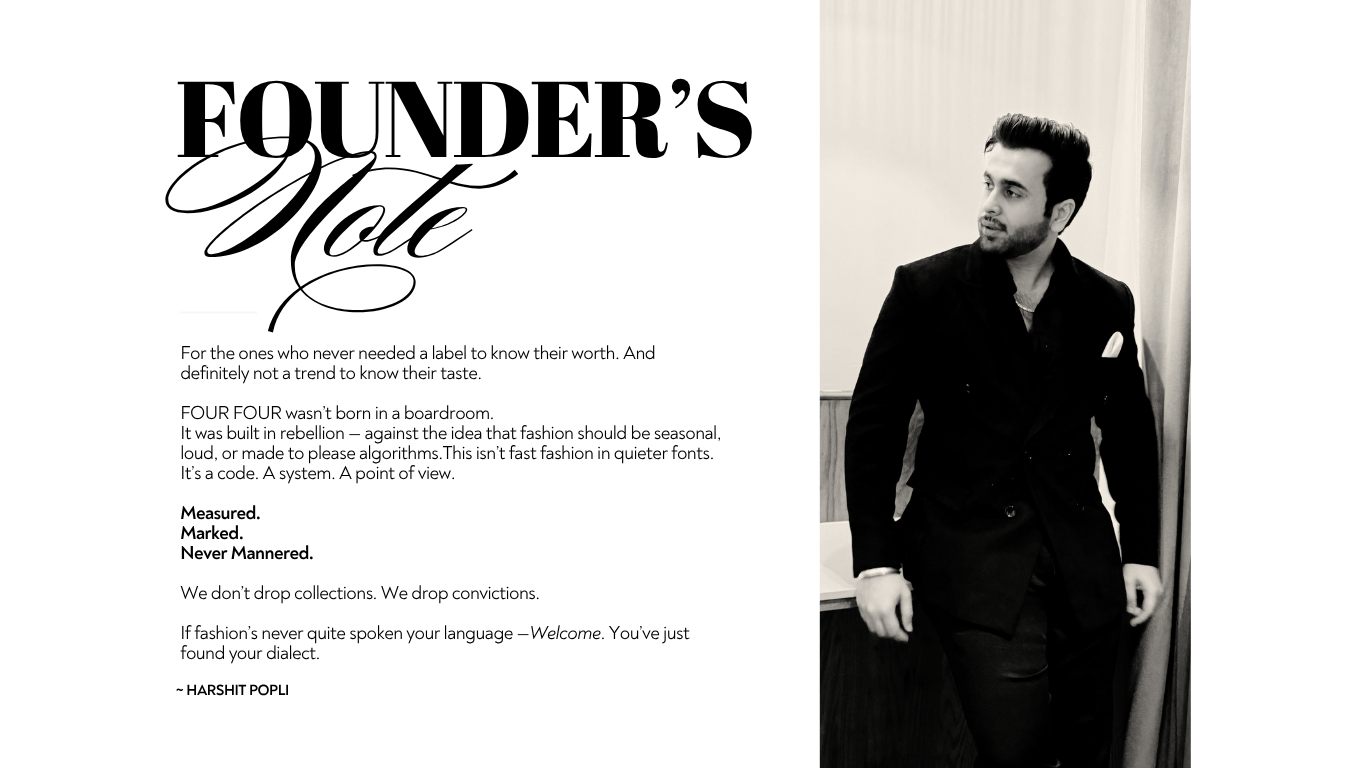 Our founder, Harshit Popli, envisioned a brand that transcends gender, occasion, and convention. With a background steeped in global fashion education and a keen eye for